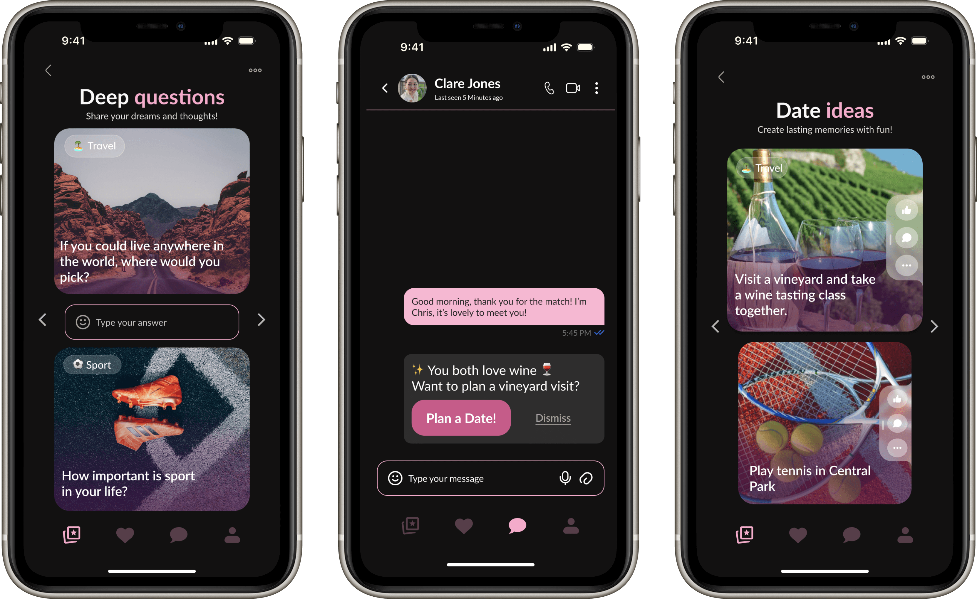 Designed a concept dating app that prioritizes meaningful connections over superficial swiping, using thoughtful profile questions, interest-based matching, and suggested real-world activities based on mutual interests.