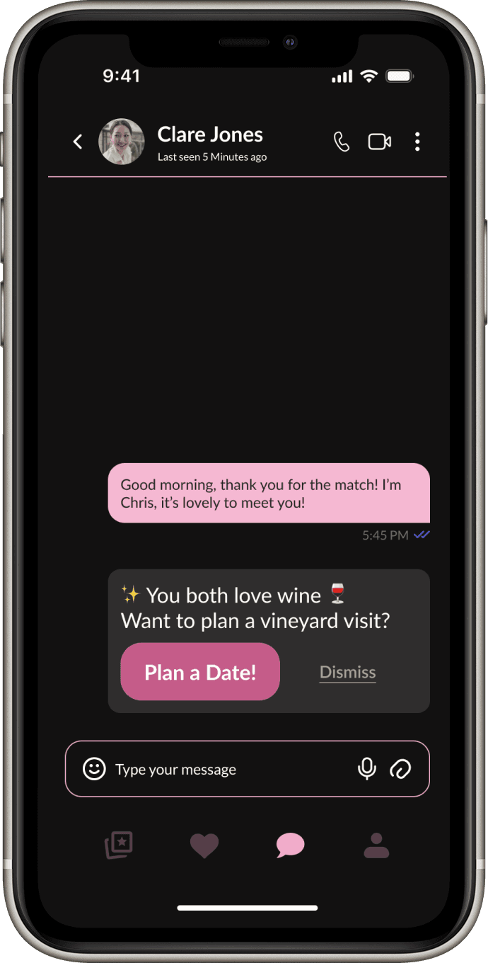 The app actively suggests shared interests during chats, like noticing you both love wine, turning small talk into real plans.