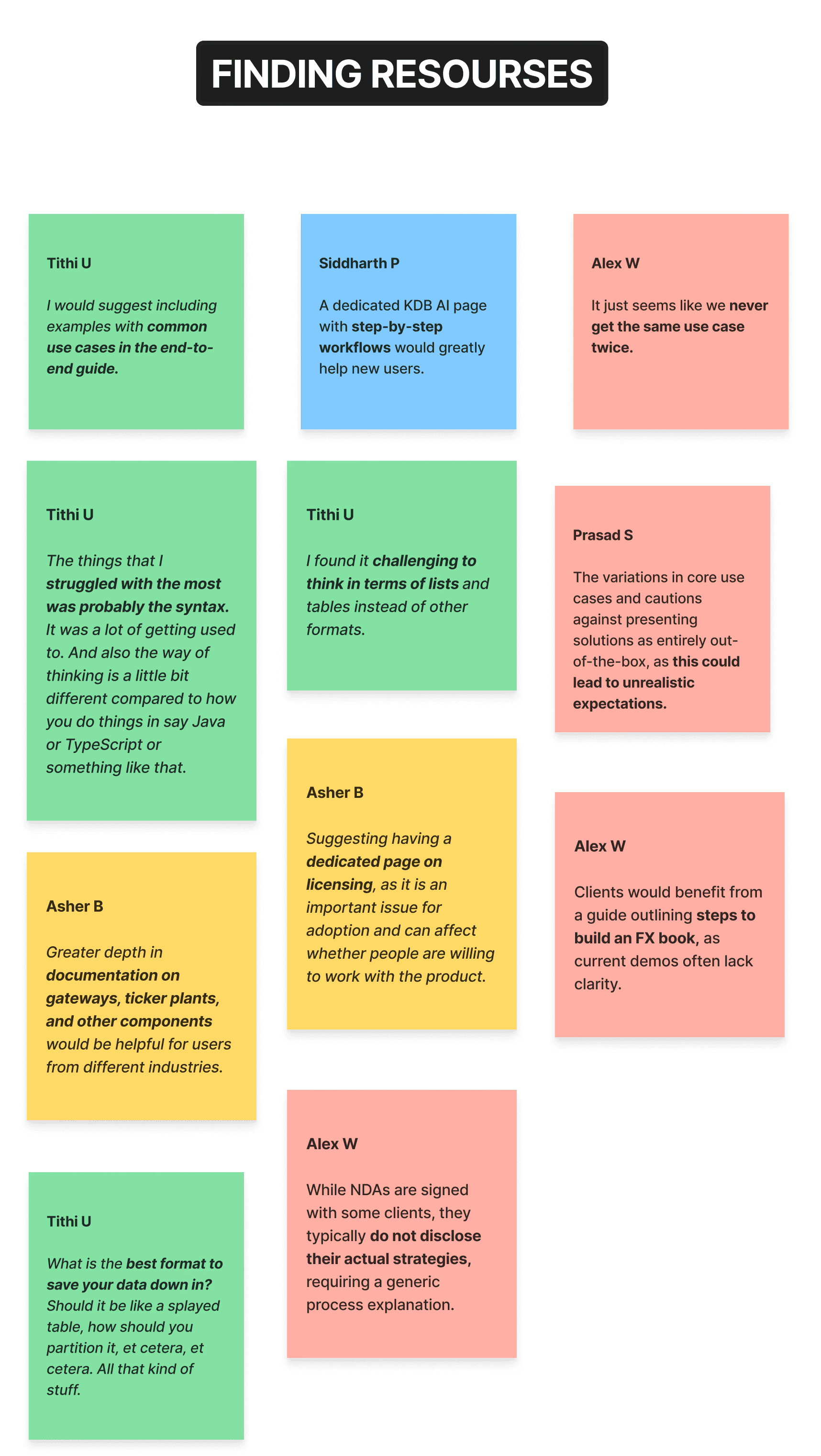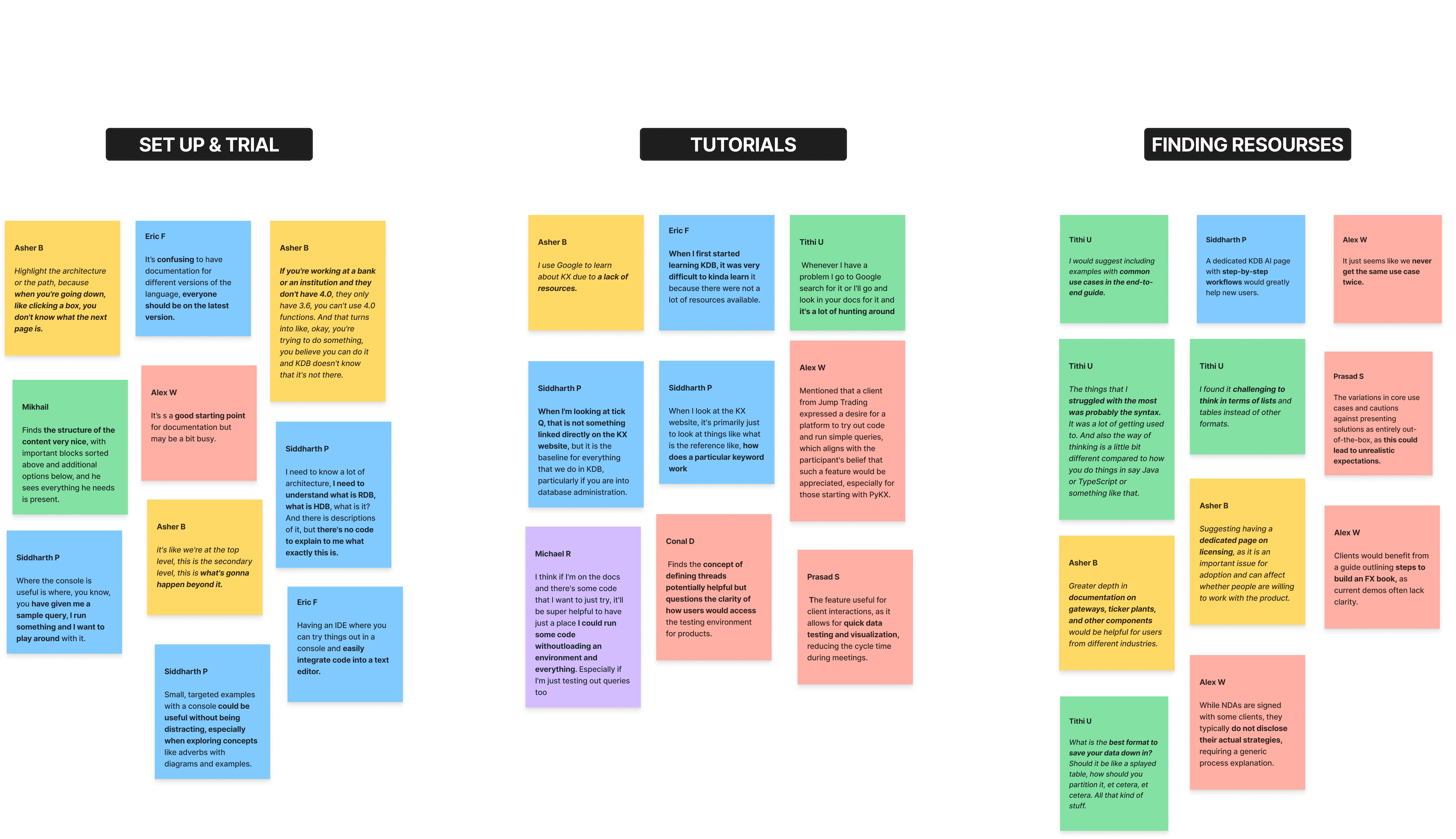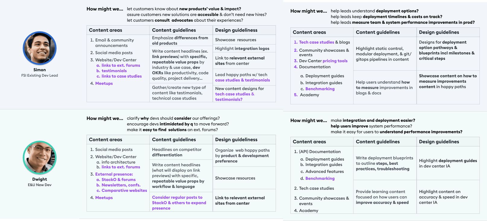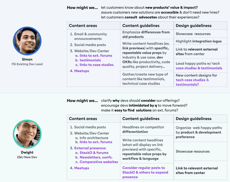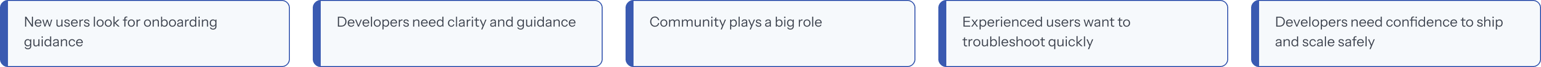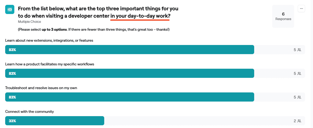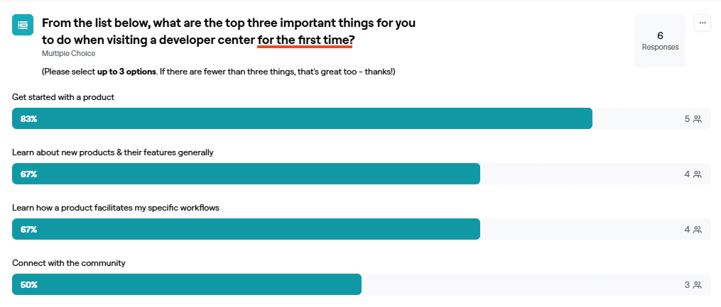 I synthesized feedback from developer focus group interviews to identify recurring pain points around onboarding clarity, content organization, and differences between new and experienced users.