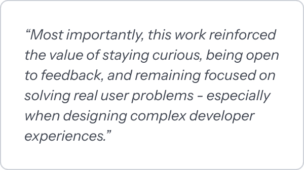This project significantly strengthened my ability to design for technical audiences and to build systems that balance clarity with flexibility. It reinforced how small, well-focused research insights can lead to high-impact design decisions.