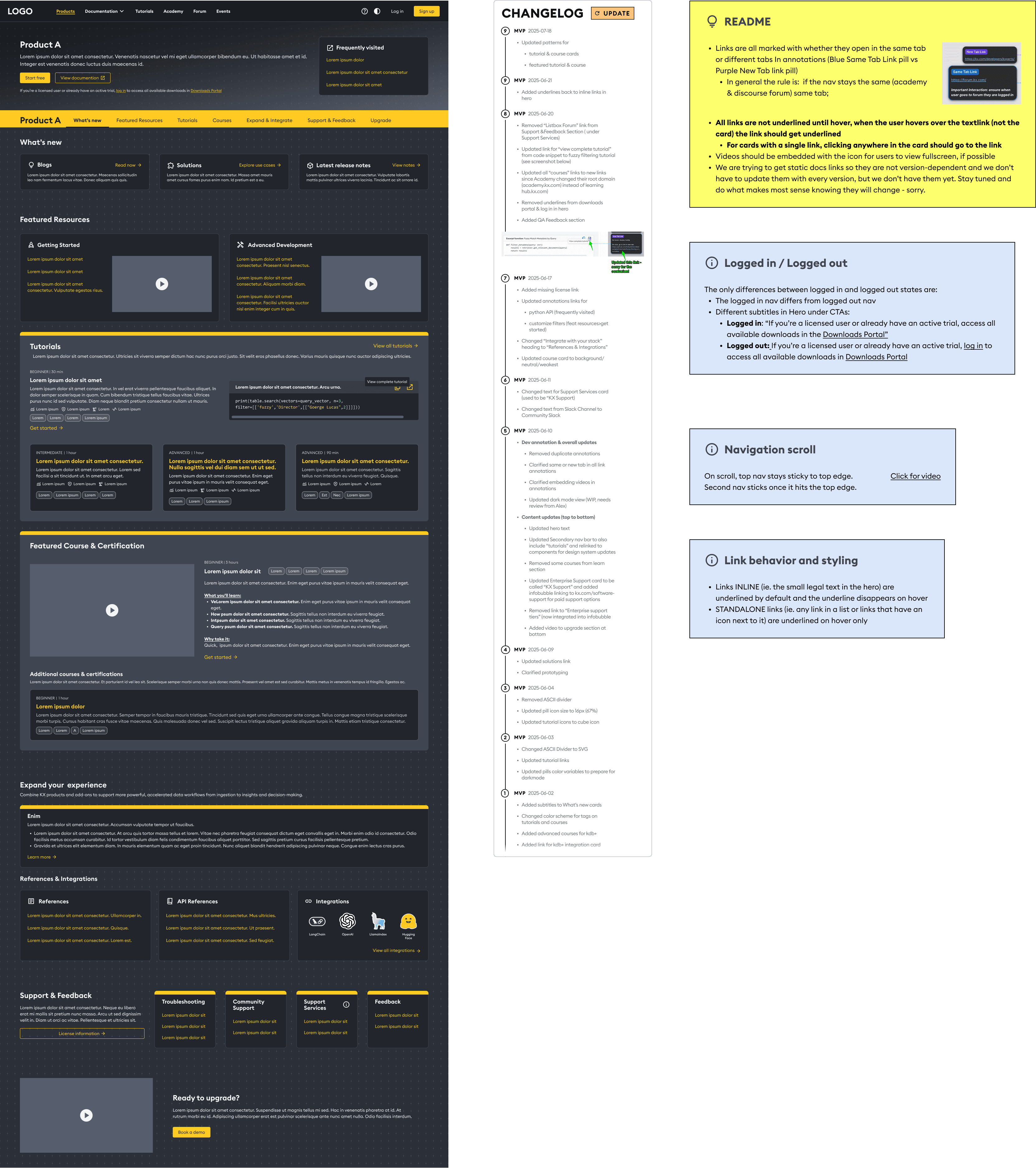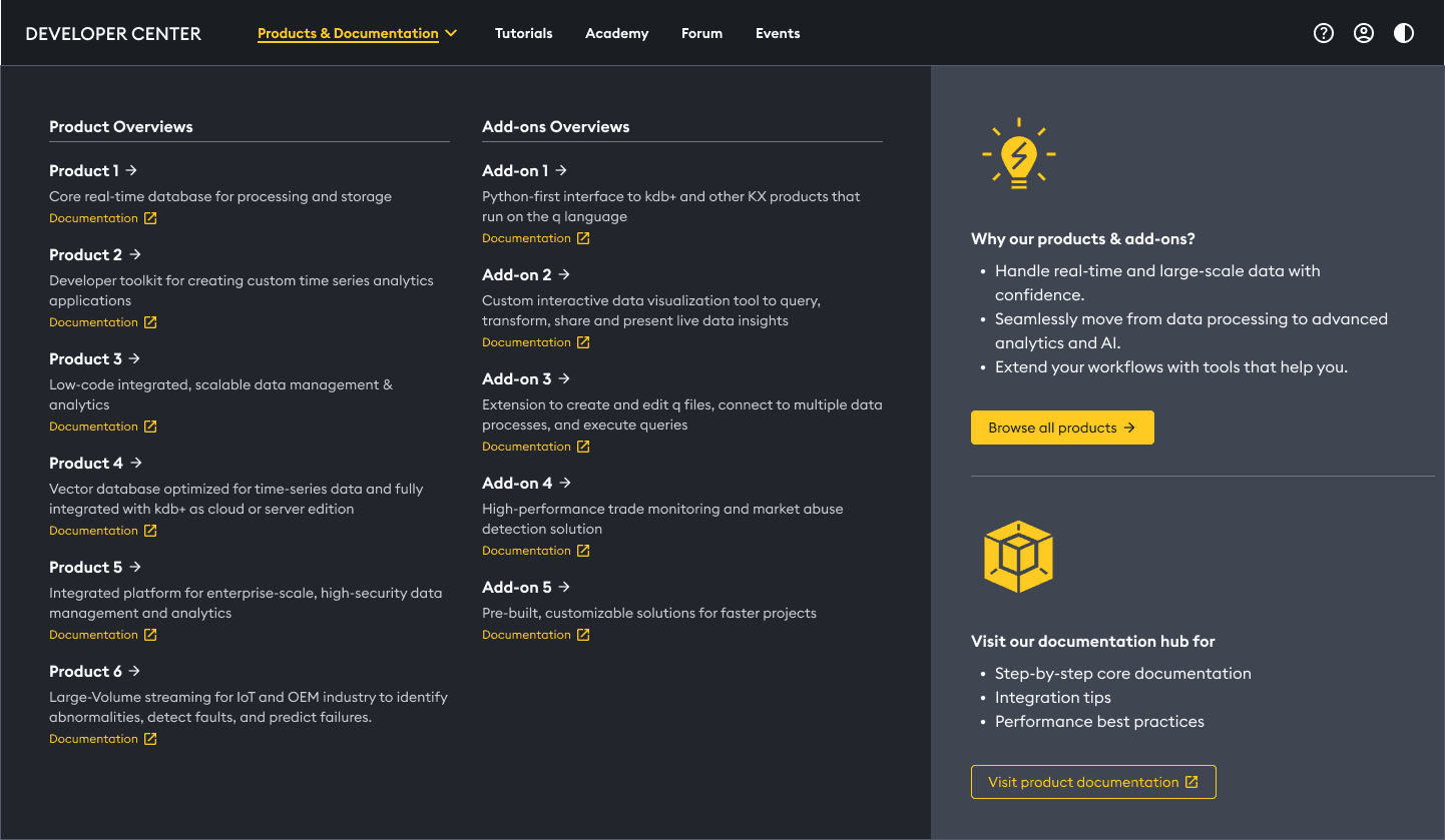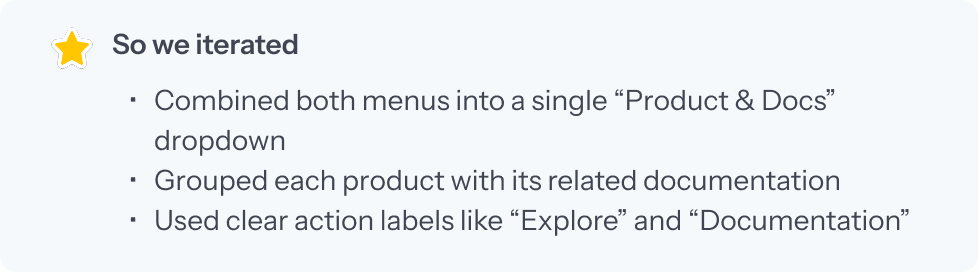 Initially, we separated "Product Overview" and "Documentation" into different menus. Usability testing showed this caused confusion - users were unsure where to click and expected docs to live closer to the tools.