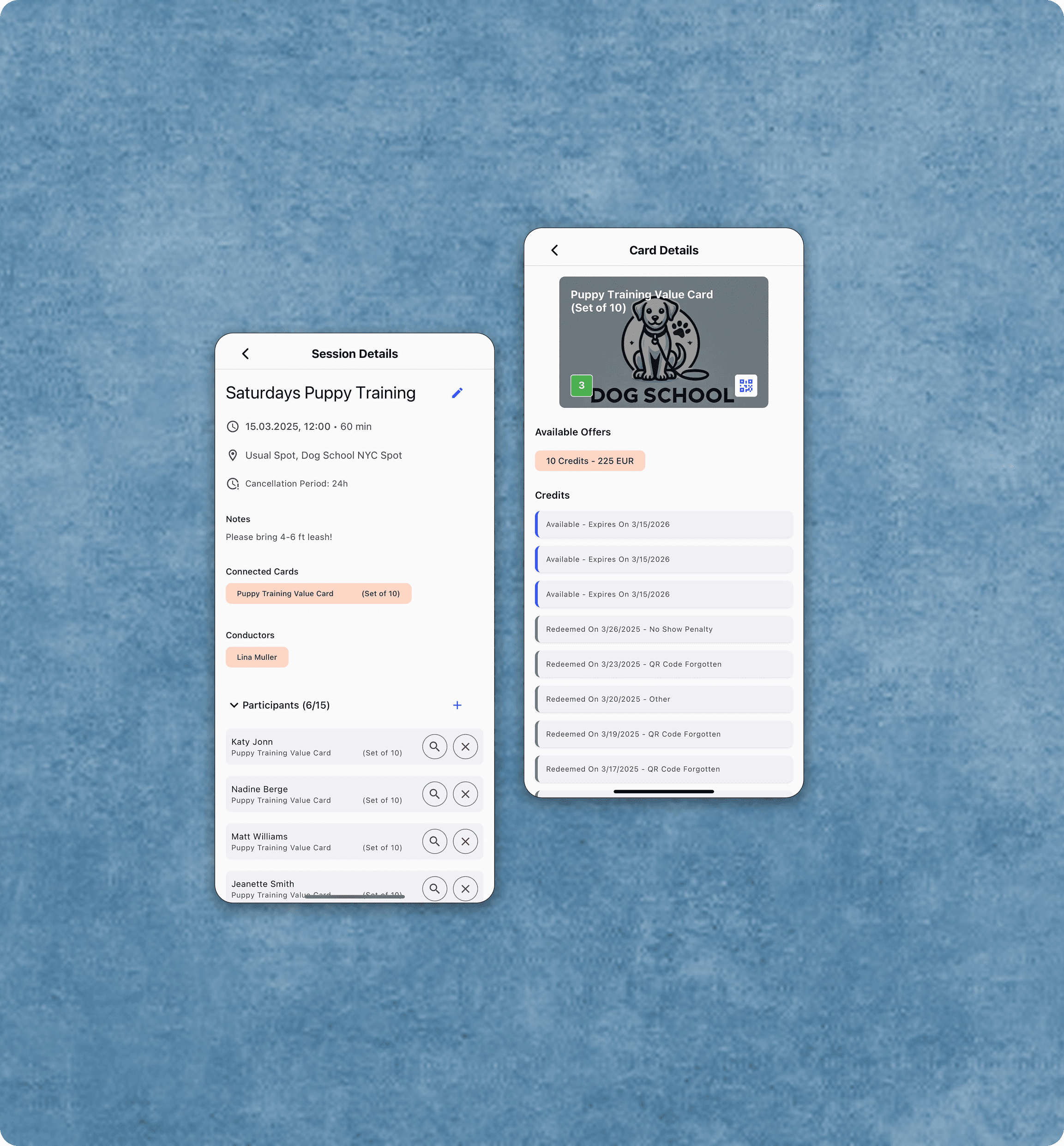 This mobile application is designed for managing a dog training school. It supports administrators or trainers in organizing training sessions, managing customer memberships, and tracking credit-based training cards. The app aims to streamline operations and provide a user-friendly experience for both trainers and dog owners.