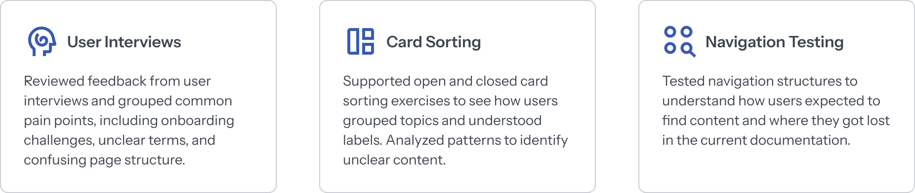 I supported the Senior Product Designer throughout the project. My responsibilities included creating testing assets such as wireframes and navigation structures, supporting card sorting exercises and navigation testing, and synthesizing findings from interviews and usability feedback.