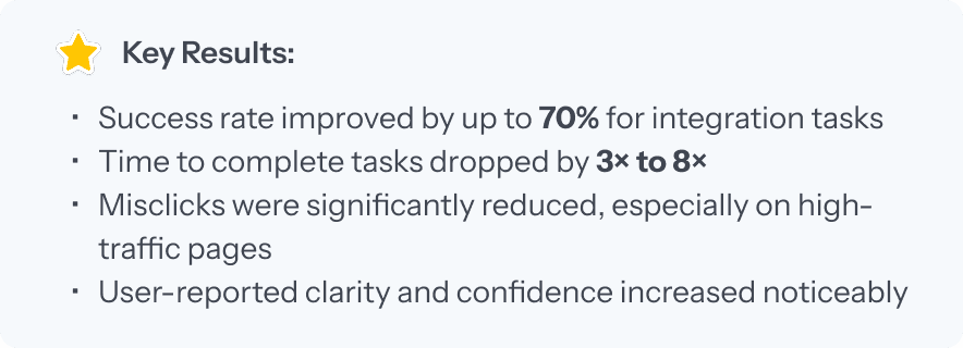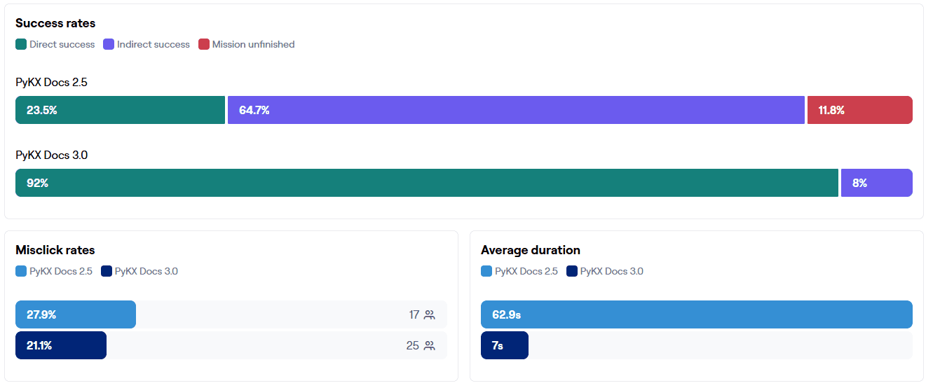To measure the impact of the new navigation, we ran an A/B test in Maze with 60 participants, comparing the redesigned layout (v3.0) with the original navigation (v2.5). Participants were randomly assigned to reduce bias and completed 10 tasks across both versions.