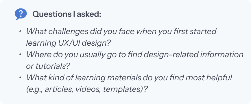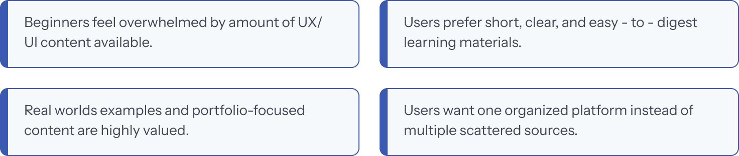 To understand the needs of beginner UX/UI designers, my teammate and I interviewed students and junior designers. We organized key insights using affinity mapping and reviewed existing learning platforms to identify strengths and gaps.