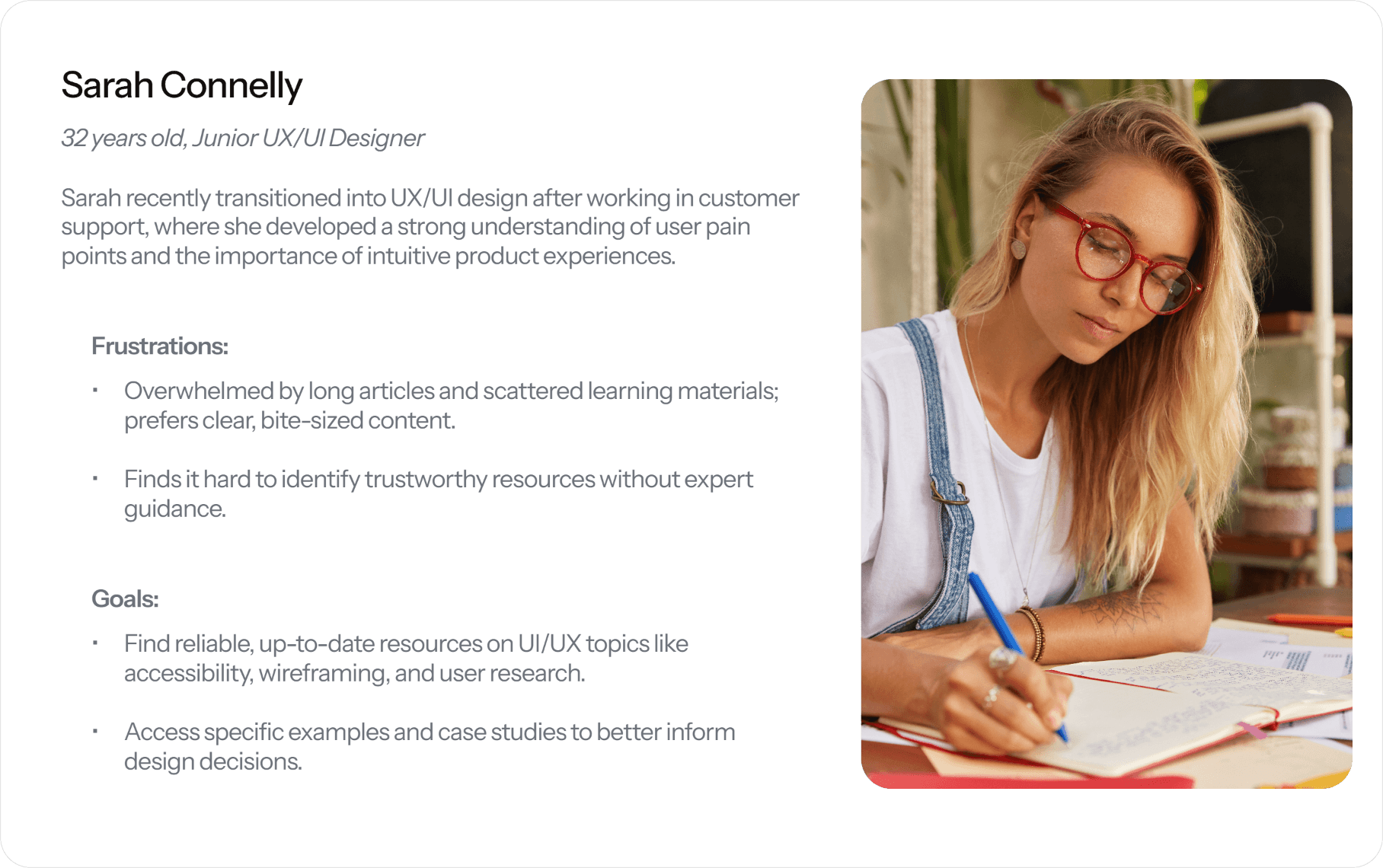 I created this persona to better understand the needs, frustrations, and goals of entry-level UX/UI designers. By empathizing with users like Sarah, I was able to shape design decisions around real learning challenges — ensuring the platform delivers value through clarity, accessibility, and relevant content.